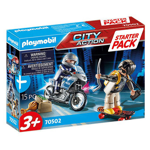 Policista pronásleduje zločince na motorce, kvuli kráděži peněz. Při zachycení lupiče bohužel zjistí, že ukradené peníze schoval do tajného úkrytu.Sada obsahuje: dvě figurky, motorku, skateboard, páčidlo a další doplňky.Vhodné pro děti od 3 let. prečítať celé