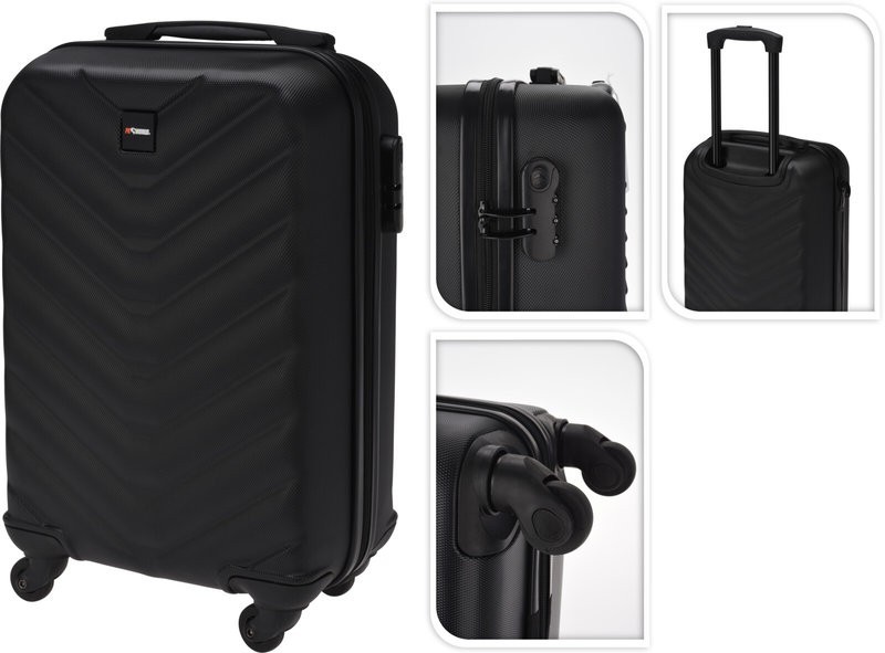 SUITCASE 18 INCH, 28 LITER 330X200X530MM BLACK COLOR, ABS DIAMOND COVER, WITH 4 SPINNING WHEELS, WITH COMBINATION LOCK ON THE SIDE, ALUMINIUM TUBE WITH TPE HANDLE AND ABS HANDLE ON TOP, WITH PRO WORLD LOGO WITH STICKER ON FRONT. ALL COMPONENTS IN BLACK COLOR, INSIDE FULLY LINING BLACK COLOR WITH U SHAPE ZIPPER POCKET, WITH ELASTIC WEBBING. EACH PIECE WITH HANGTAG IN POLYBAG/ 340X210X520MM, Hangcard: , 330X200X530MM / CFT 4,97,(1.916/40ft HQ)