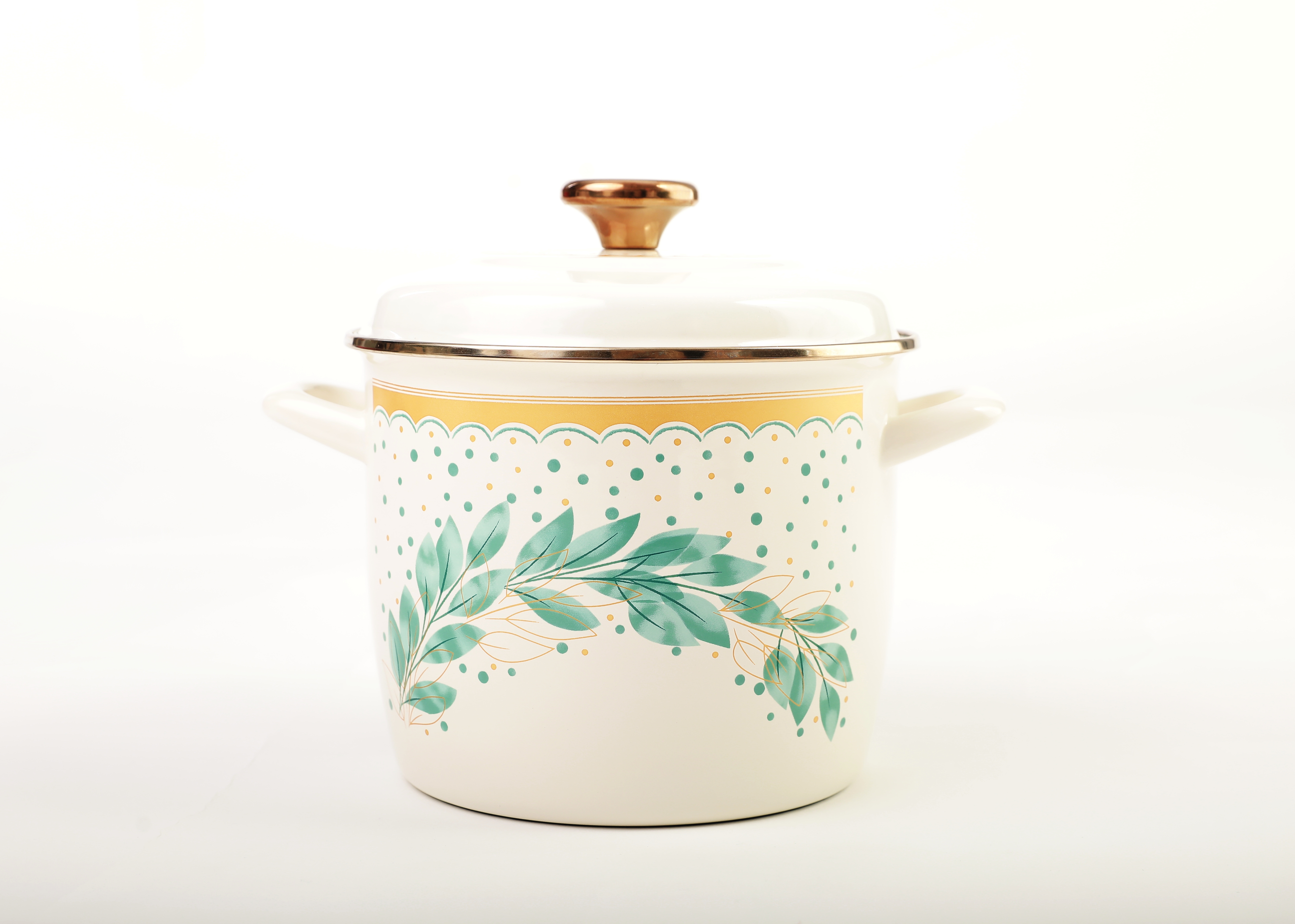 Luxusní smaltované nádobí nejvyšší jakosti. Nádobí je ozdobeno nádherným obtiskem lístků s přidanými prvky ve zlaté barvě. Obtisk krásně ladí s kování a nerezovými ráfky, které jsou taktéž ve zlatém provedení.