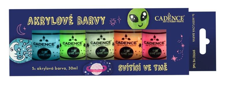 Efektové barvy, které pohlcují světlo a svítí ve tmě. Po určité době může efekt záře postupně odeznívat, namalovaný předmět je potřeba opět vystavit světlu a nabít ho. Barvy se nanáší se štětcem. Doporučujeme nanést aspoň dvě-tři vrstvy, nebo barvy nanášet na předmět již podmalovaný akrylovými barvami. Pomůcky lze snadno umýt mýdlem a vodou. Souprava obsahuje 5 ks barev, objem 30 ml.