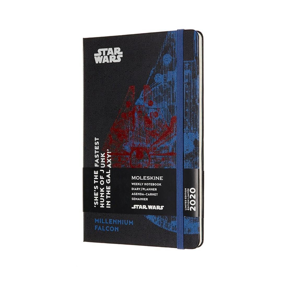 Velký plánovací zápisník Star Wars na rok 2020. Na levé straně jsou dny v týdnu a na pravé linkovaná stránka na poznámky. Diář má pevnou, ve hřbetu šitou vazbu v kartonových deskách. Obepíná ho pružná páska proti samovolnému otevírání. Diář obsahuje praktickou vnitřní kapsu na vizitky a dokumenty, která je vyrobena z tkaniny a kartonu, textilní záložku a tematické samolepky. Papír s gramáží 70 g/m2 neobsahuje kyseliny.