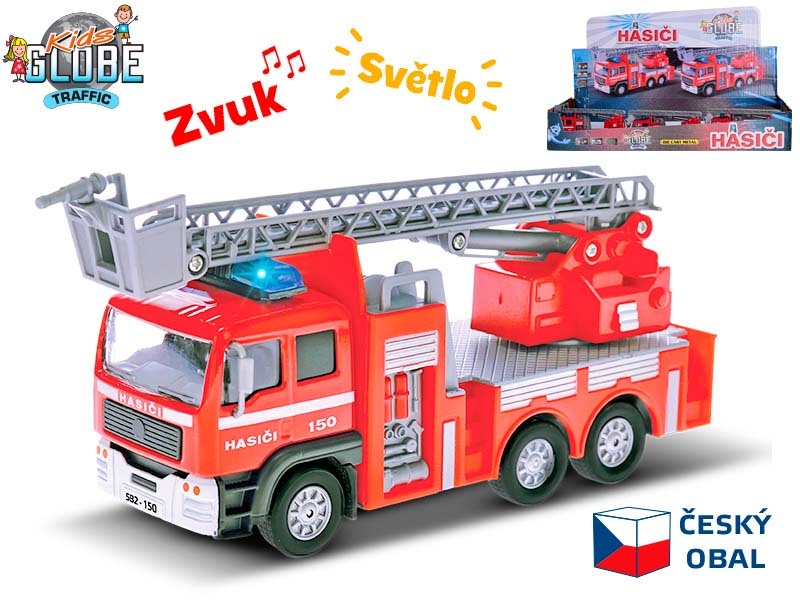 Kids Globe Traffic hasiči 14cm kov spätný chod na batérie český design svetlo a zvuk 12ks v DBX