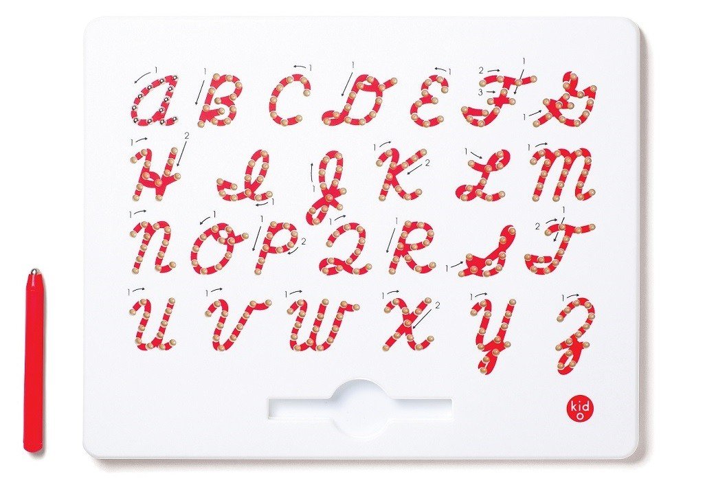 Kid O magnetická tabulka pro nácvik správného psaní velkého psacího písma složená z magnetických kuliček a pera. Dítě prostřednictvím nakreslených šipek obkresluje magnetickým perem linii písmene správným směrem. Díky působicí síle mezi magnety dítě cítí a slyší, jak vyskakují magnetické kuličky...