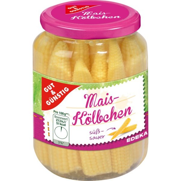 GG Mladé kukuřičky ve sladkokyselém nálevu 340gVelmi chutné nakládané kukuřičné klasy. Malé kukuřičky se konzumují celé, včetně klasu, který je křehký a velmi chutný. Kukuřičky jsou výborné syrové, ale i tepelně upravené. prečítať celé