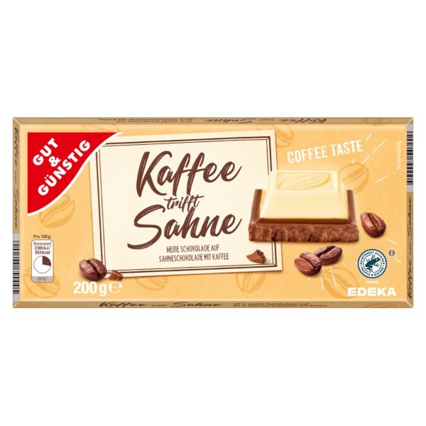 GG Smetanová čokoláda s kávovou příchutí a bílou čokoládou 200gDokonalá kombinace 37% bílé čokolády, 63% smetanově kakaové čokolády a kávy. Kakao je z udržitelného zemědělství - Certifikace Rainforest Alliance.Vyrobeno v Německu. prečítať celé