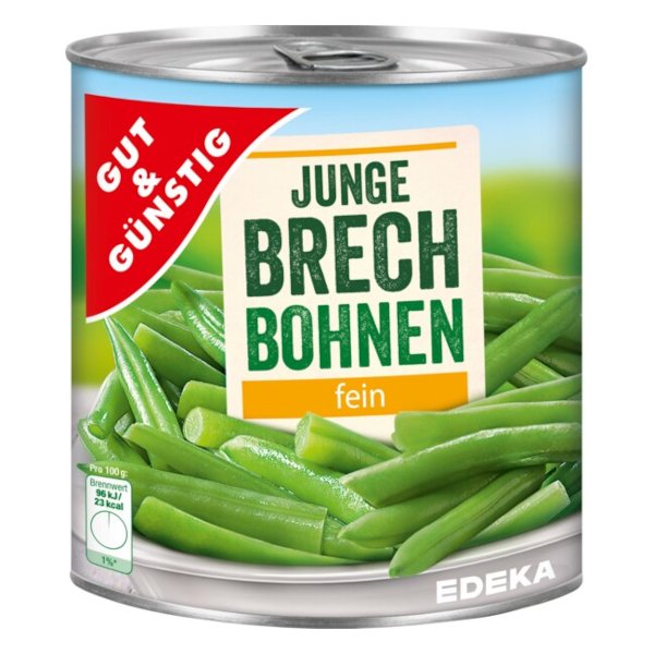 GG Mladé zelené fazolky - jemné - 800gMladé, zelené fazolky v jemně slaném nálevu jsou připravené k okamžité přípravě nejrůznějších pokrmů. Můžete je využít jak v teplé kuchyni (jako přílohu k masu, do polévek, do zeleninových směsí i rizota), tak studené kuchyni (do salátů). Fazolky obsahují významný podíl bílkovin, vitaminy A, B, C, vápník, fosfor, železo i vlákniny. Dodávají jídlu potřebné živiny a chuť.