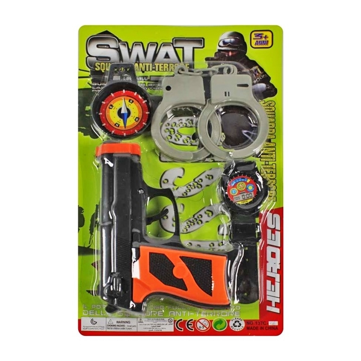 Sada malého policistu. Balení obsahuje imitace - kompasu, pout, hodinek a zbraně. Nevhodné pro děti do 3 let.Rozměr zbraně - 13,5 x 10,5cm prečítať celé