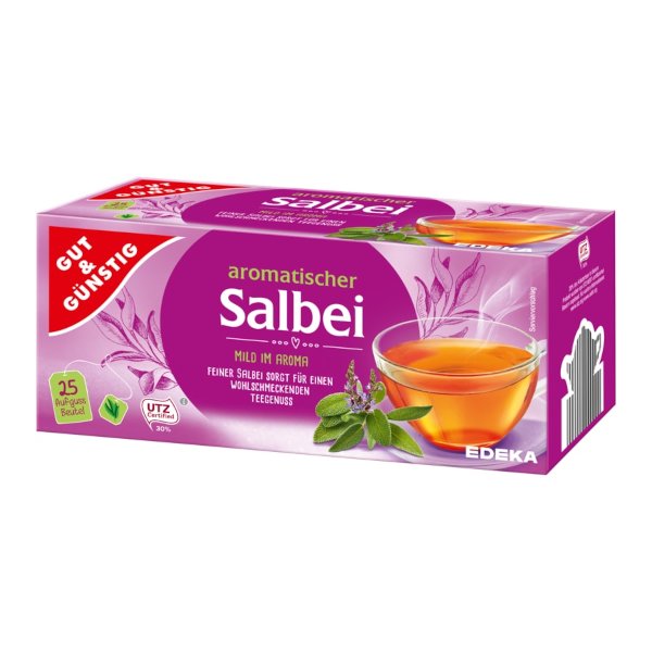 GG Německý šalvějový čaj 100% 25 sáčků, 37,5gZdraví prospěšný čaj ze 100% šalvěje který podporuje obranyschopnost, pomáhá normální funkci dýchacího systému a také působí preventivně při chorobách ústní dutiny.Zalévejte vždy vařící vodou a nechte louhovat minimálně 5-6 minut.