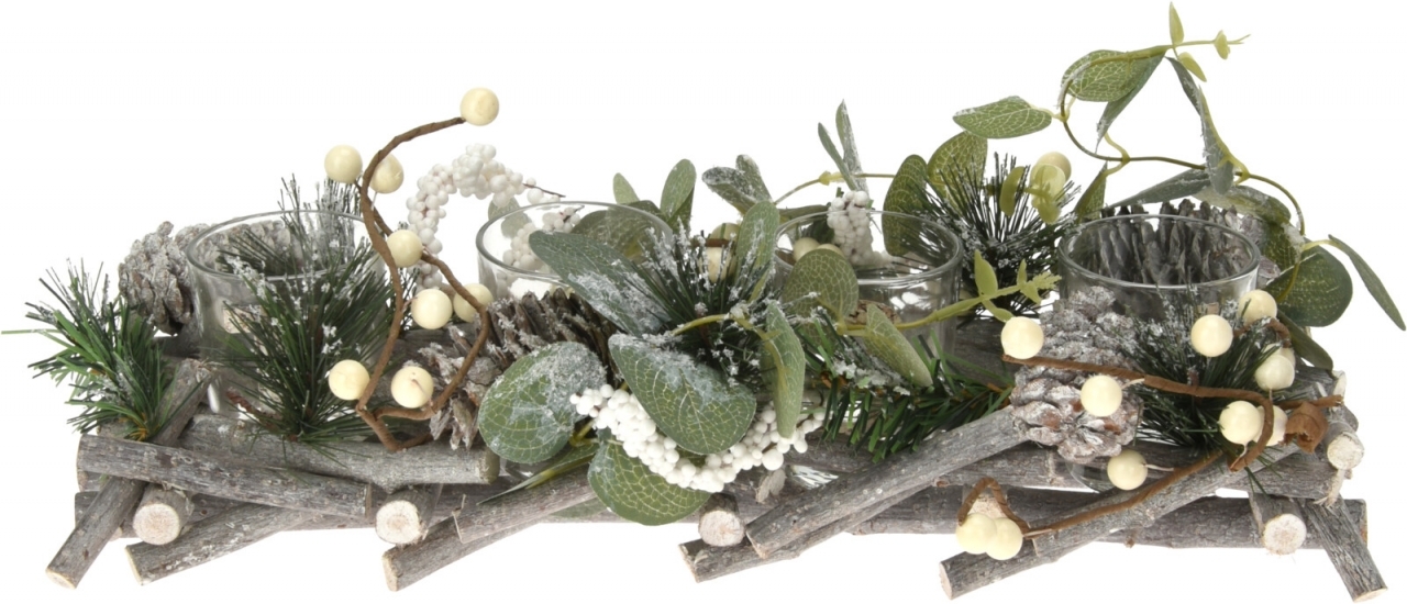 Dekorativní dřevěný svícen z dřívek na 4 čajové svíčky. Svícen je zdobený šiškami, bobulkami, eukalyptem a umělým chvojím borovice a jedle, zasněžený umělým sněhem. Součástí jsou skleněné kalíšky na svíčku.Materiál: dřevo, plast, skloRozměry:výška 8 cmšířka 36 cmhloubka 13 cmsvícen 5,5x5,5x6,5 cm