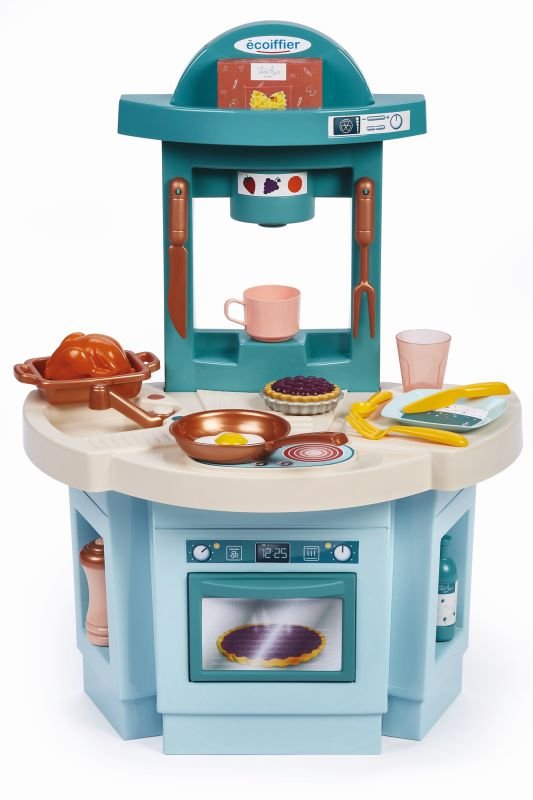 Kompaktní kuchyňka v azurové barvě na hraní má troubu, sporák se dvěma hořáky, dřez s kohoutkem a různé police a háčky na uložení příslušenství. Kuchyňské doplňky zahrnují pánev se sázeným vejcem, pekáč se smaženým kuřetem, náčiní na pečení, talíř s příbory, sklenici, hrnek, mlýnek na pepř,...