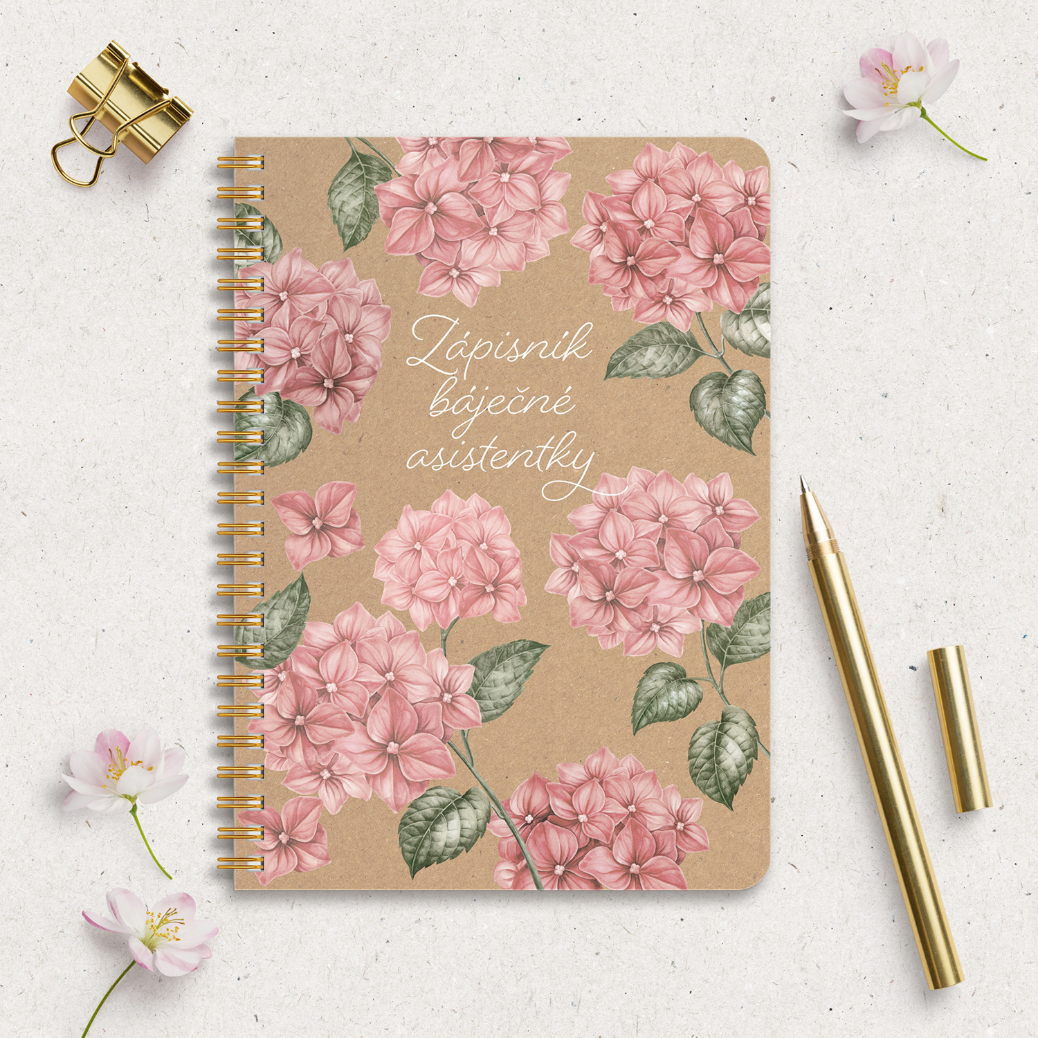 Zápisník s kovovou kroužkovou vazbou ve zlatavé barvě je zdoben květy hortenzie z přední i zadní strany.