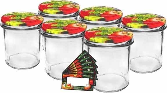 Sada 6-ti sklenic o objemu 346 ml. Kompletní se samolepicími barevnými štítky o rozměrech 4,8 x 8,5 cm - můžete na ně dát datum přípravy výrobku a další informace o obsahu každé sklenice.Zavařovací sklenice s ozdobným barevným víčkem - ideální pro domácí pochutiny z vašeho oblíbených dobrot....