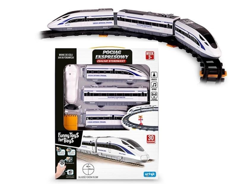 Pociąg na pilota 30 el., w zestawie: 2 lokomotywy, wagon, tory, drzewa, znaki, pilot, długość toru 176 cm., funkcje: dźwięk, światło prečítať celé