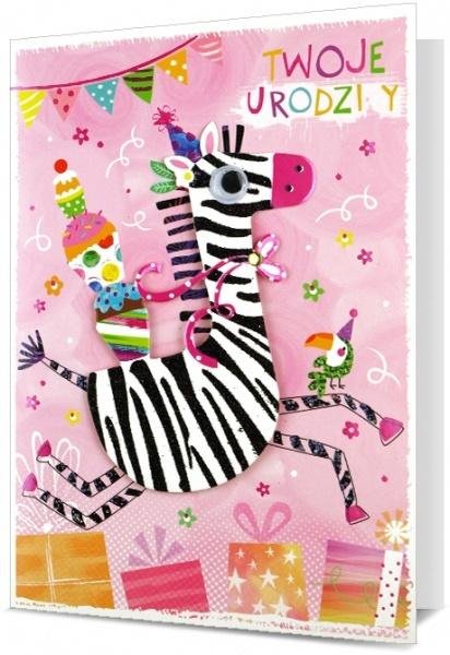 Wesoły i kolorowy urodzinowy karnet dziecięcy.Przestrzenne aplikacje, ruchome oczka, folia hologramowa, brokat. prečítať celé