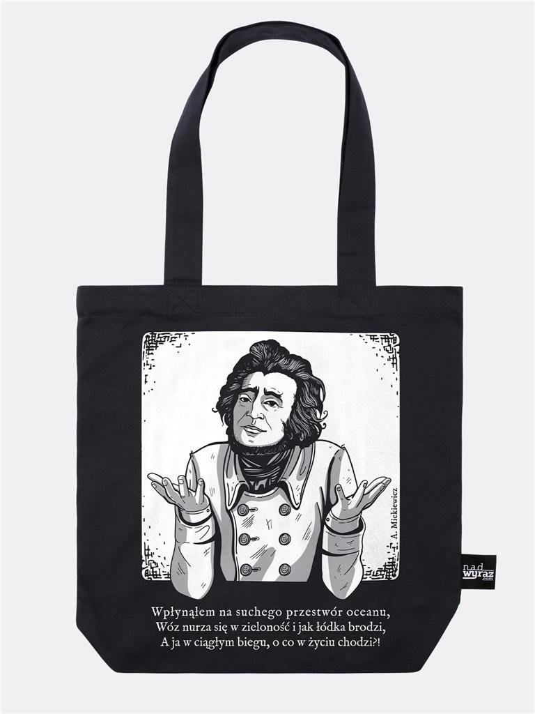 Wpłynąłem na suchego przestwór oceanu,Wóz nurza się w zieloność i jak łódka brodzi,A ja w ciągłym biegu, o co w życiu chodzi?Jak żyć? O co w życiu chodzi? Te pytania zadaje sobie zatroskany Adam Mickiewicz na naszej stylowej torbie, która z pewnością zachęci niejednego współpasażera miejskiego...