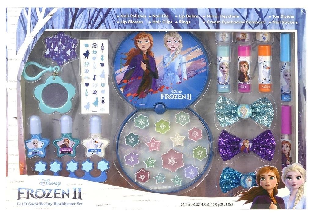 Zestaw Frozen, który zawiera lustro, 1 searator do paznokci, 3 balsamy do ust, 3 pierścienie, 3 lakiery do paznokci, 3 spinki, 2 błyszczyki do ust, 1 arkusz naklejek, kompaktowy okrągły zestaw z kremowymi cieniami do powiek.