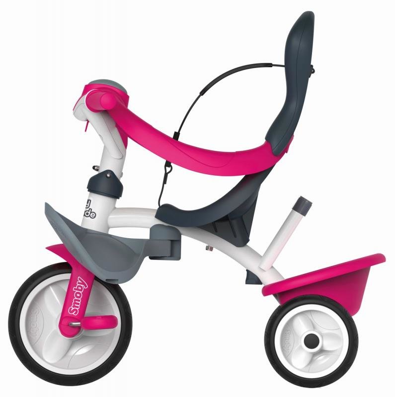 Šlapací tříkolka se stříškou proti sluníčku v barevném provedení pro holčičky. Kovový rám, nastavitelná a odnímatelná vodící tyč, lze s ní ovládat i směr jízdy, bezpečnostní ochranný rám a pás, opěrka pro nožičky, pokud dítě ještě nedosáhne na pedály. Plastová kola s protihlukovou úpravou. Možnost zablokování šlapadel, výklopný plastový košík. Praktická taška na vodící tyči. Rozměry 68 x 101x 52 cm. Hmotnost 5,47 kg.