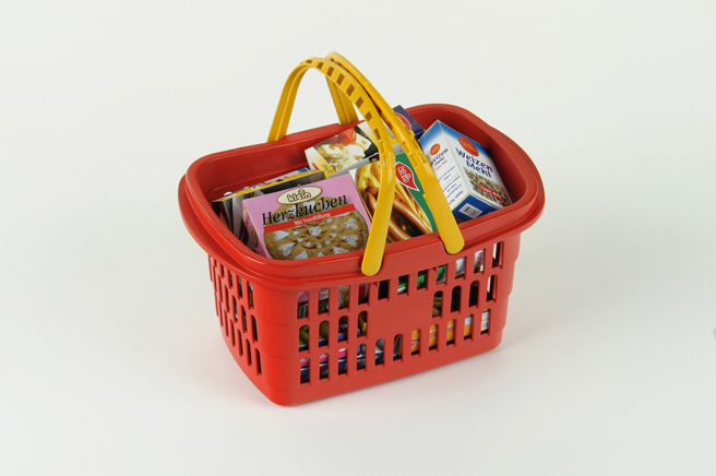 Dětský nákupní košík červený se žlutými madly. V košíku jsou makety potravin. prečítať celé