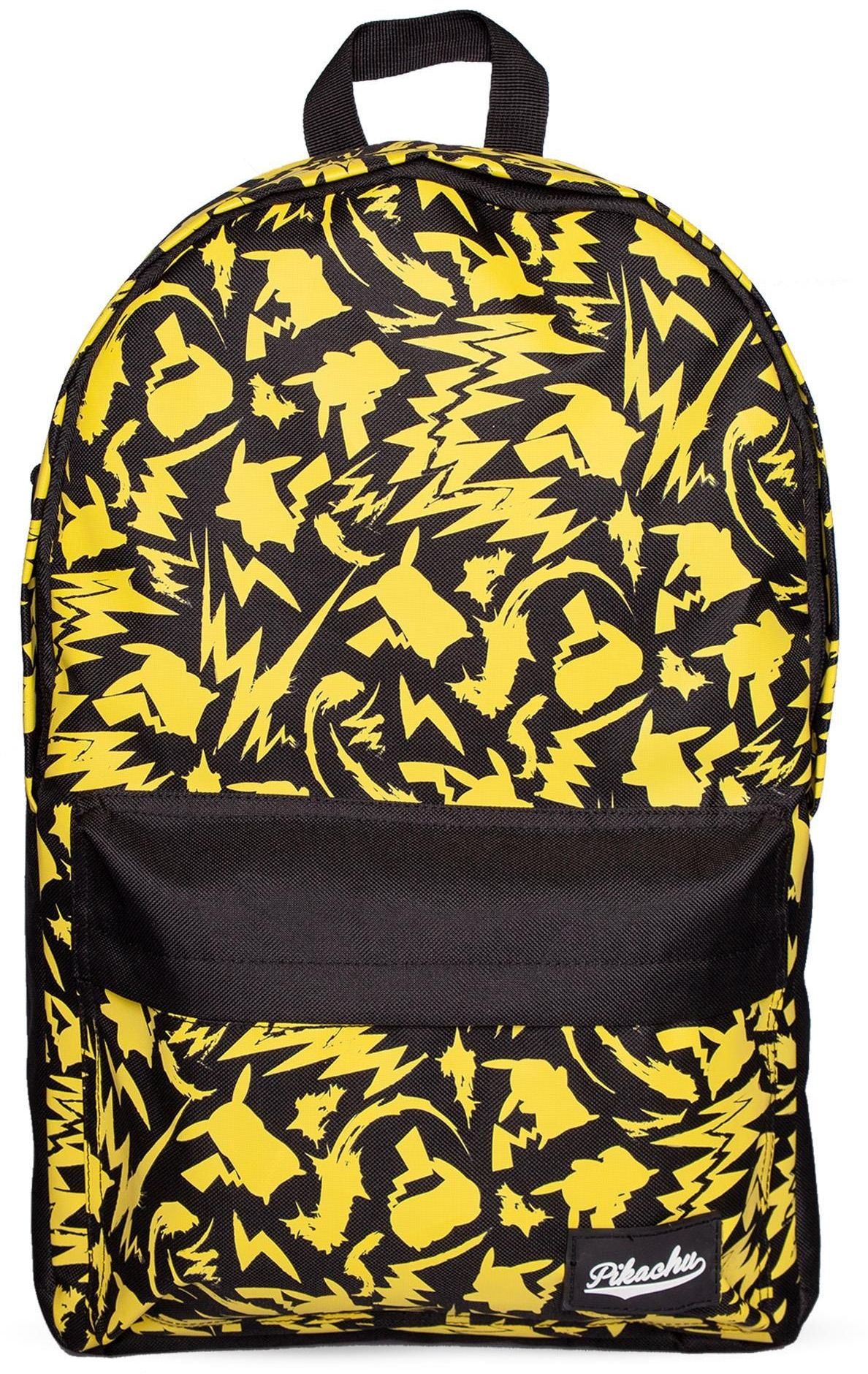 Černý batoh vyvedený s celoplošným potiskem postavičky Pikachu.