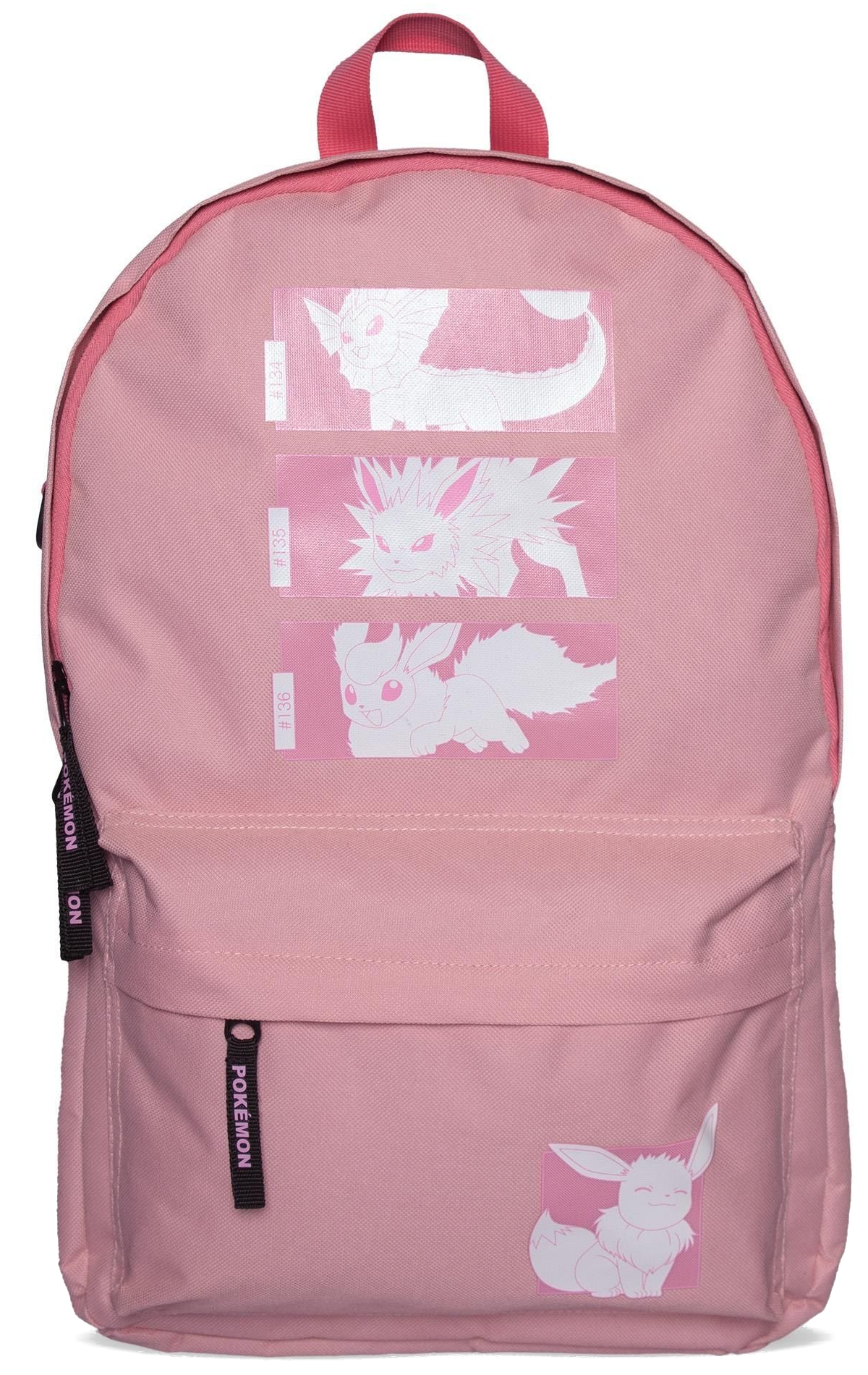 Růžová batoh vyvedený v motivu pokémona Eevee a různými grafickými a designovými detaily Pokémon