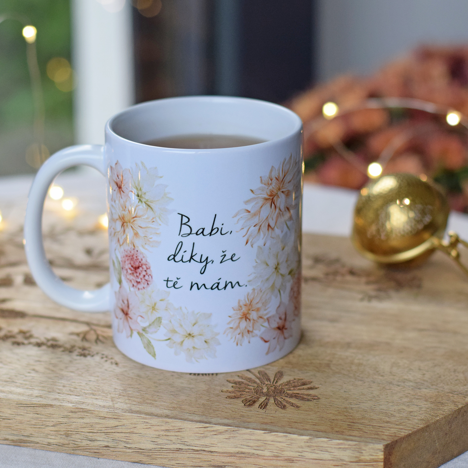 Keramický hrnek zdobený jemnými malovanými květy a doplněn o český text je skvělý dárkem pro babičku. objem: 330 ml prečítať celé