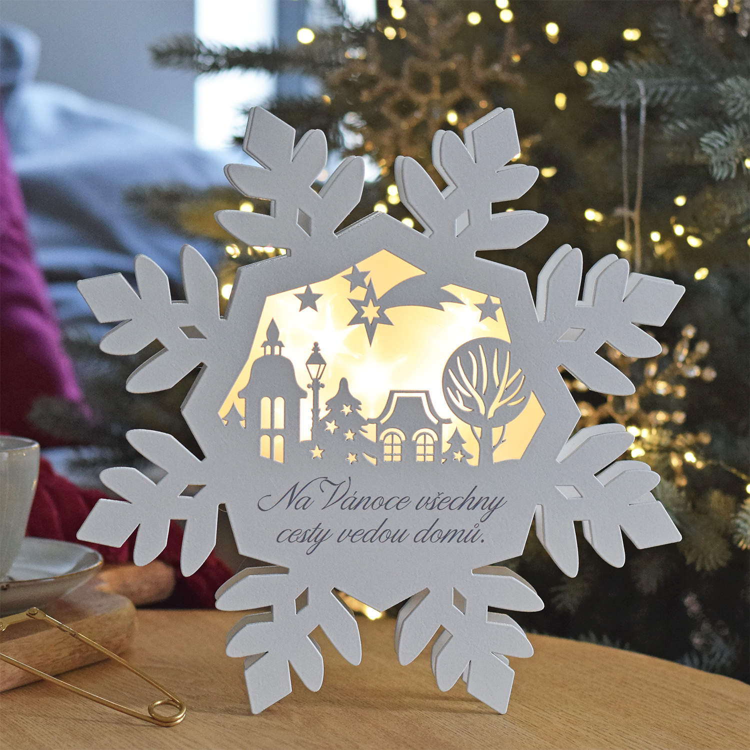 Vánoční dekorace jsou naší specialitou. Tato krásná svítící vločka není vyjímkou. Zvelebte si domov českou dřevěnou dekorací. Můžete si ji postavit na poličku, ke krbu, na okno...A pak už jen užívat vánoční atmosféry! velikost: 26 x 26 cmnabíjení na 2 AA baterie (Nejsou součástí)