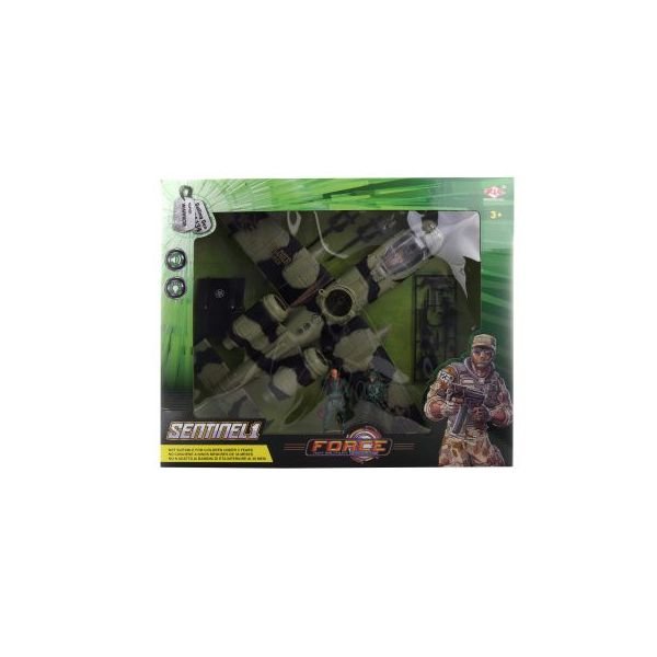 Vojenská sada s velkým letadlem. Letadlo svítí a vydává zvuky. Napájení na 2 AA baterie (nejsou součástí). Součástí balení jsou také 2 vojáčci a zbraně. Rozměry balení cca 50,5 x 42 x 14 cm. Věk 3+ prečítať celé