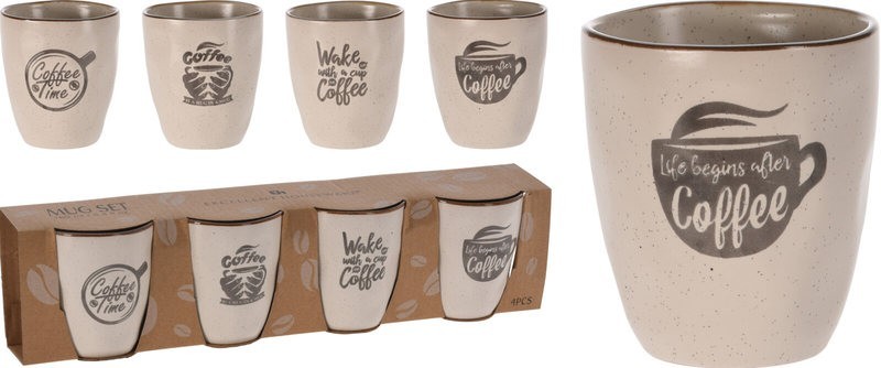 MUG WITHOUT HANDLE, STONEWARE, 160ML/5,41 OZ, SET OF 4PCS, SIZE: DIA 68XH77MM, WEIGHT: 148 GRAM A PIECE, TAUPE COLOR WITH 4 DIFFERENT COFFEE DESIGNS IN A SET: COFFEE TIME, COFFEE IS A HUG IN A MUG, WAKE UP WITH A CUP OF COFFEE AND LIFE BEGINS AFTER COFFEE. REACTIVE GLAZE BROWN RIM, IN CRAFT...