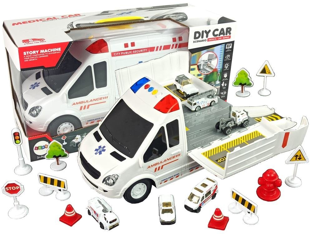 Ambulans Transportowy Parking Dźwięki Światła Napęd Frykcyjny Autka Akcesoria Ambulans medyczny jest potrzebny każdej ekipie ratunkowej. Zapewne znajdzie zastosowanie u małego przyszłego lekarza, ratownika medycznego lub kierowcy. Dzięki ambulansowi mały lekarz będzie mógł poczuć się jak...