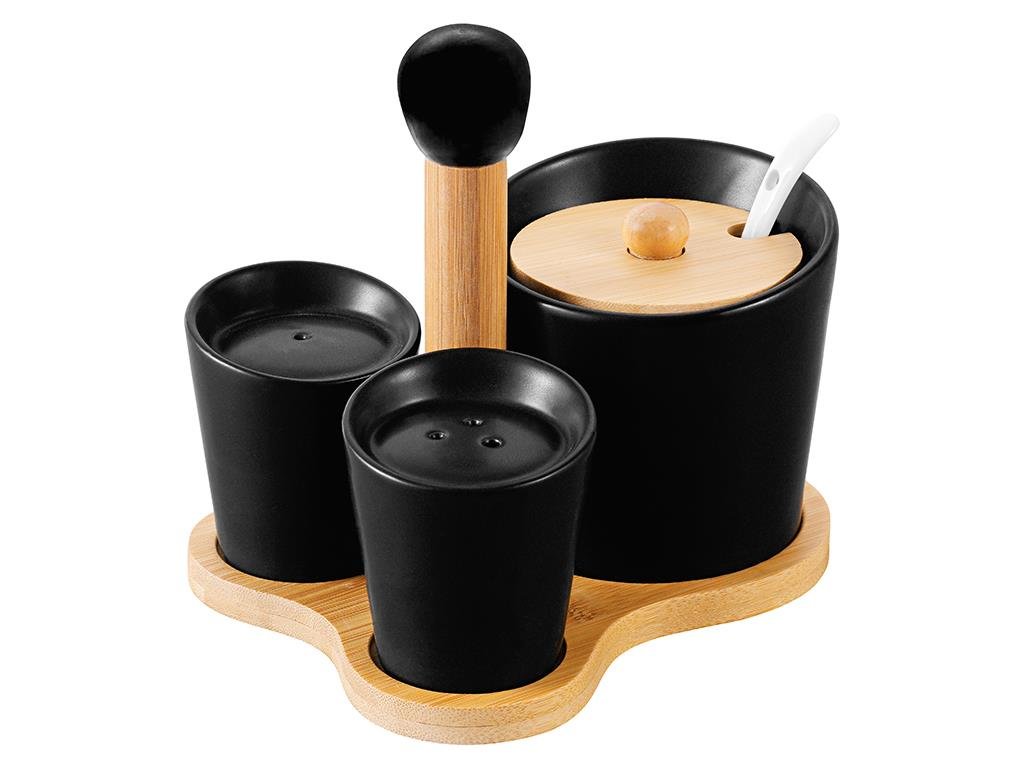 SOUPRAVA CUKROVIN, SOLINICE A PAPRIKA NA BAMBUSOVÉM STOJANU, MATERIÁL: KERAMIKA, ROZMĚRY: CUKROVINY-9,5X9,5X9; Krabice na sůl a pepř-6X6X6,7; STOJAN - 16,2X13,3X12, BAMBUS POUZE RUČNÍ MYTÍ, PORCELÁN VHODNÝ DO MYČKY NÁDOBÍ prečítať celé