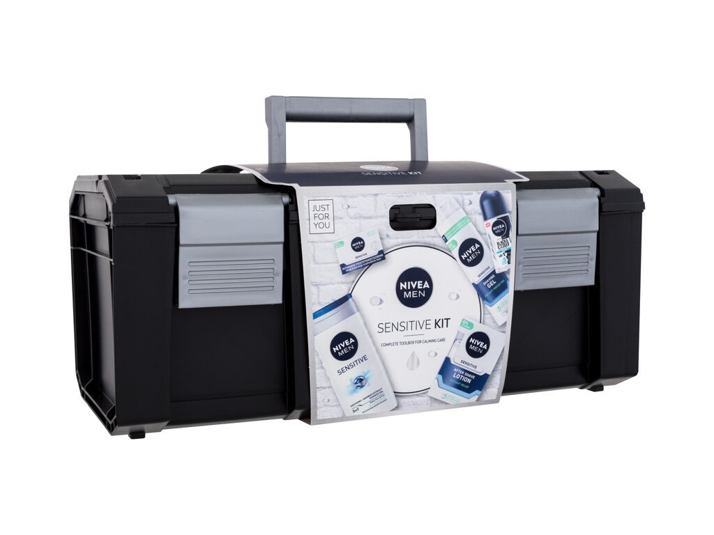 Nivea Men Sensitive denní pleťový krém Men Sensitive 50 ml + voda po holení Men Sensitive 100 ml + gel na holení Men Sensitive 200 ml + sprchový gel Men Sensitive 250 ml + antiperspirant Black & White Invisible Fresh 50 ml + box na nářadí