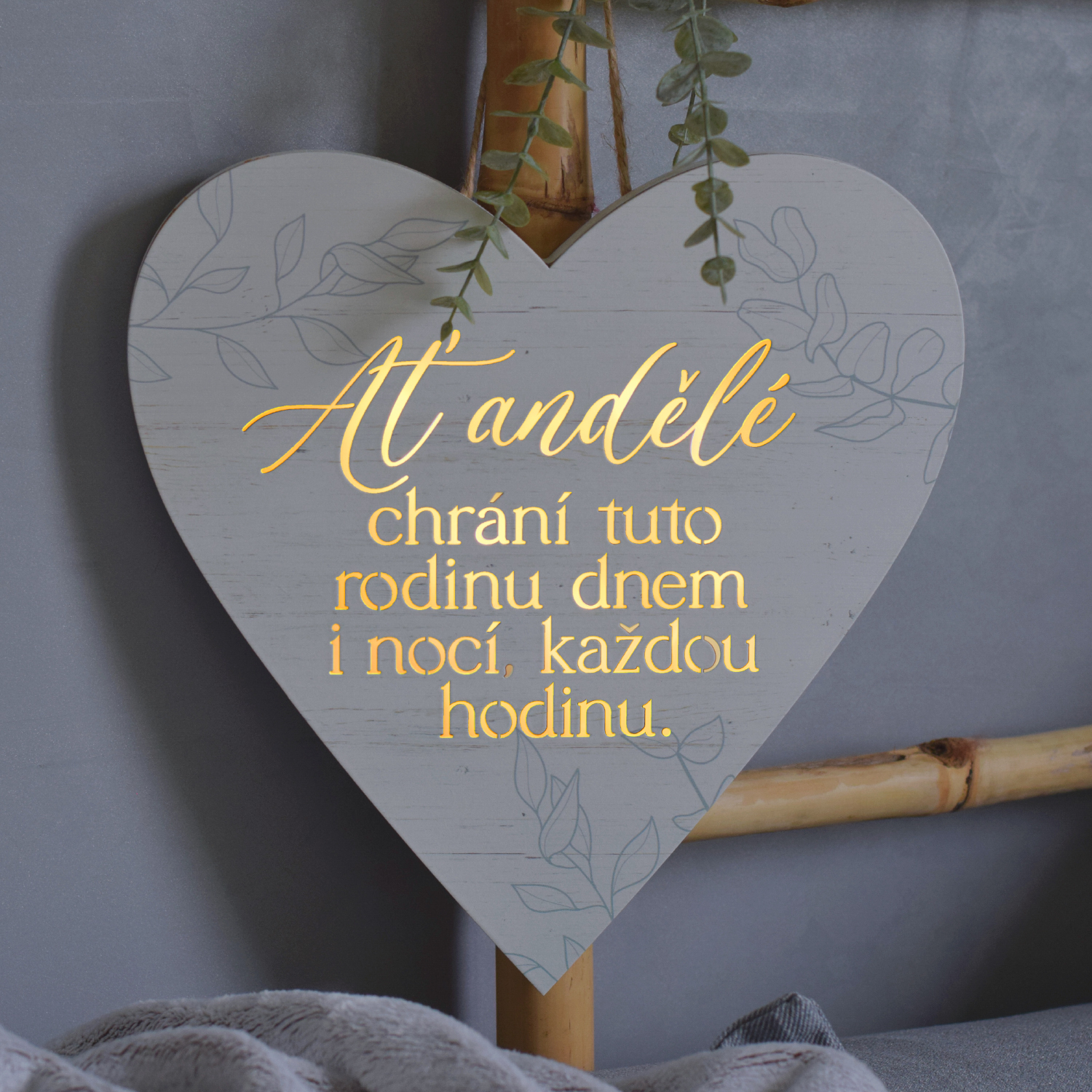 Dřevěná dekorace se svítícím citátem potištěná větvičkami eukalyptu. Toto krásné srdce Vám doma udělá útulný efekt, který okouzlí každou návštěvu. rozměr: 30 x 29,5 cm Led srdce se zapíná pomocí ovladače ze zadní strany a je napájeno pomocí dvou AA tužkových baterií. (Baterie nejsou součístí...