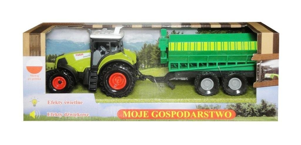 Plastikowy traktor z przyczepą. Pojazd świeci światełkiem oraz wydaje dźwięki: zapalania silnika, klaksonu oraz cofania. Zabawka działa na baterie typu AG13. Baterie znajdują się w zabawce. Zabawka dla dzieci od 3 lat. Podane wymiary są wymiarami opakowania. prečítať celé