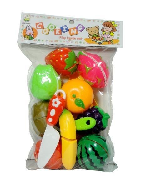 Zestaw owoców do krojenia. Owoce w zestawie poprzekrawane są na pół, łączą się za pomocą rzep. Wsród owoców znajduje się m.in.: jabłko, arbuz, winogrono, kiwi i truskawka. W zestawie oprócz owoców można znaleźć nóż, deskę do krojenia, talerzyk oraz komplet sztućców. prečítať celé
