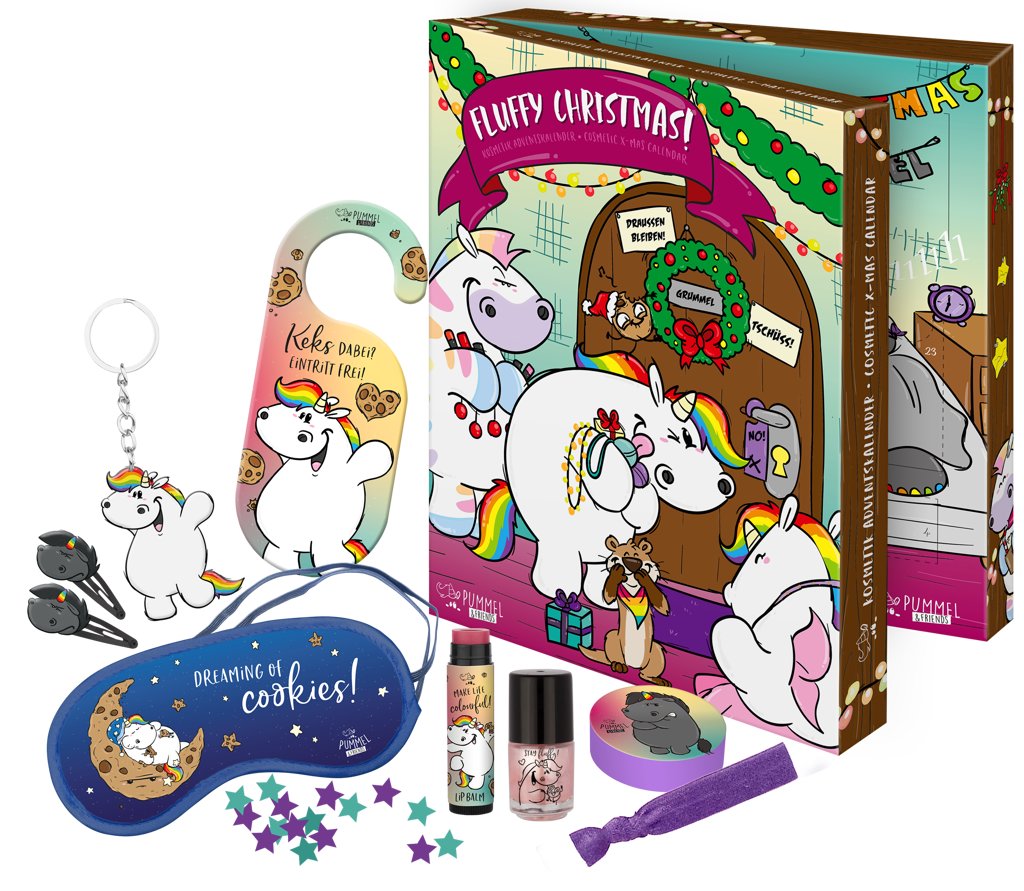 Adventní kosmetický kalendář Jednorožec a jeho přátelé. Kalendář obsahuje 2 laky na nehty, 2 lesky na rty, 2 balzámy na rty, 2 kovové sponky, 1 náramek, 2 sáčky konfet do vany, 2 šumivé koule do vany, 2 přívěsky na klíče, 2 čelenky do vlasů, 1 sponka do vlasů, 1 visačka na dveře, 1 šňůrka na krk, 1 odznak, sada špuntů do učí, 1 spací masku. Vše demratologicky testováno, odpovídá přísným normám EU.