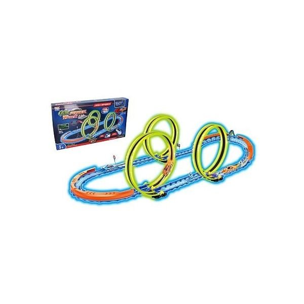 Autodráha svítící RC na dálkové ovládání. Rozměry dráhy 103x51x23 cm. Součástí jedno auto na dálkové ovládání. Infračervený signál. Obrázkový návod na složení na zadní straně obalu. Auto bateriový pack 3.7V součástí, ovladač 2xAAA baterie nejsou součástí. Přepínač ON/OFF na ovladači a spodní...