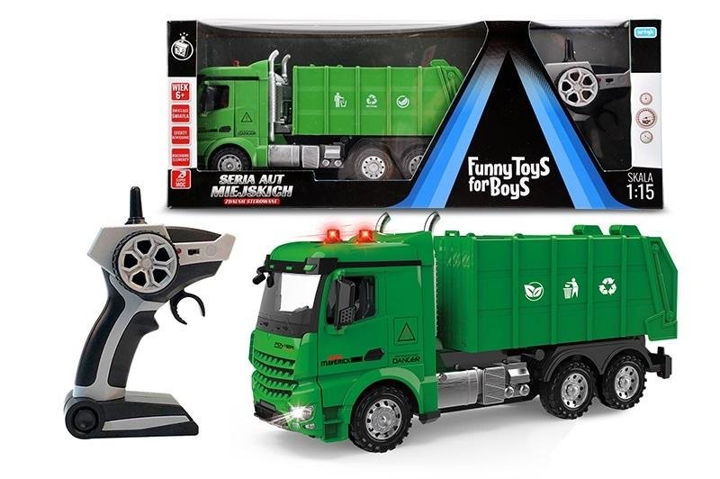 Auto miejskie zdalnie sterowane Śmieciarka. Funkcje: pełen zakres jazdy, działające światła przednie, w czasie jazdy działające światła tylne, świecące syreny alarmowe, 2 tryby jazdy: tylko ze światłami lub jazda ze światłami i dźwiękiem syreny alarmowej, otwierane drzwi, uchylna skrzynia z otwieraną tylną klapą.