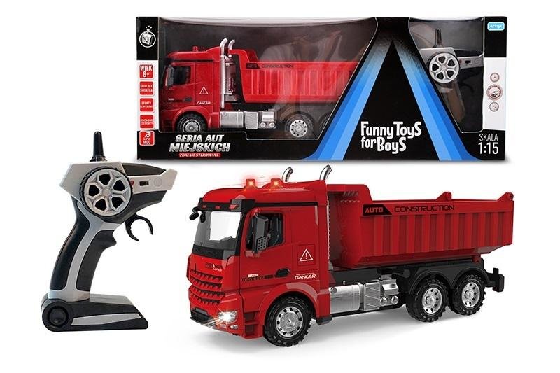 Auto miejskie zdalnie sterowane Wywrotka. Funkcje: pełen zakres jazdy, działające światła przednie, w czasie jazdy działające światła tylne, świecące syreny alarmowe, 2 tryby jazdy: tylko ze światłami lub jazda ze światłami i dźwiękiem syreny alarmowej, otwierane drzwi, uchylna skrzynia z otwieraną tylną klapą.