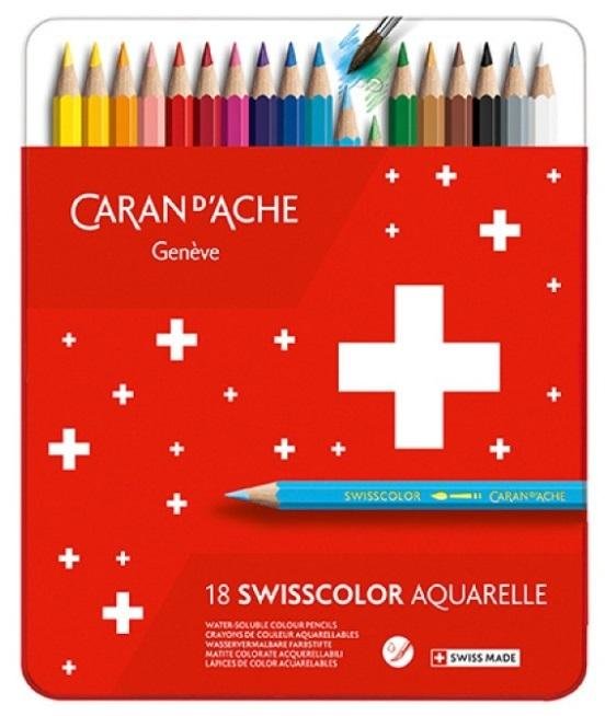 Metal Box of 18 Colours Pencils SWISSCOLOR Water-solubleVodou ředitelné pastelky v balení nesoucí švýcarské barvy.Balení Caran d’Ache Swisscolor je ideální pro milovníky kreslení, kteří hledají typický suvenýr Švýcarska, který je nadčasový. Produkty řady Swisscolor jsou vyráběny v našich dílnách...