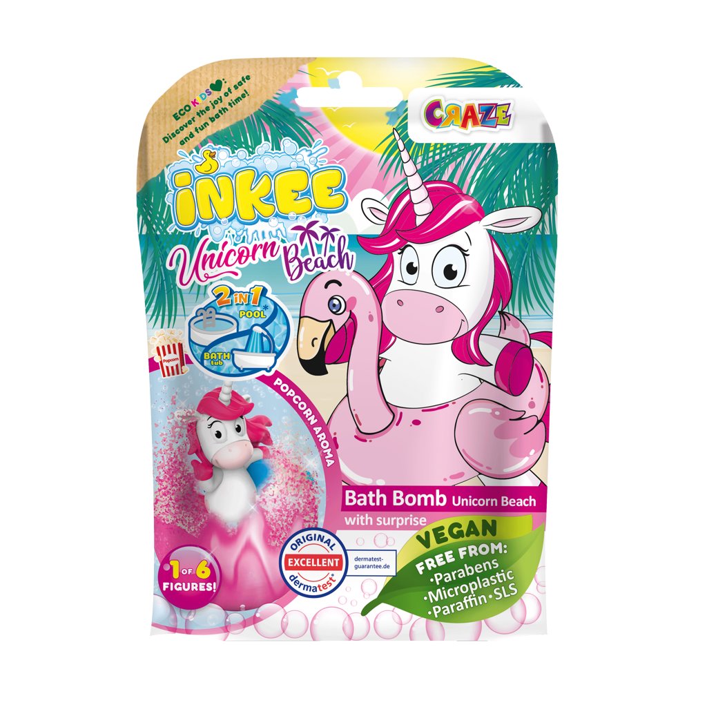 INKEE Šumivá bomba do kúpeľa s prekvapením - Plážový jednorožec premení vašu kúpeľ na nezabudnuteľný zážitok plný zábavy aj oddychu. Nielenže provoní vašu kúpeľňu sladkou vôňou popcornu, ale jej nežné šumenie a farebná premena vám ponúknu chvíle odpočinku a potešenia, ktoré si naozaj zaslúžite.