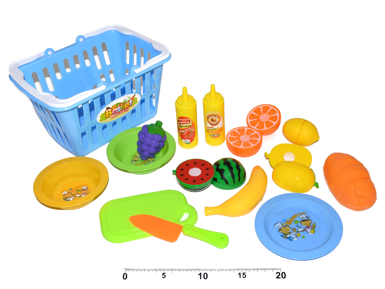 Nákupní košík plný potravin, kuchyňského náčinní a ovoce či zeleniny. Malý kuchař si může vyzkoušt bezpečné krájení. Jednotlivé dílky potravin jsou spolu spojeny pomocí suchého zipu. Materiál plast. Varianta ovoce nebo zelenina. Doporučený věk: 3+*Uvedená cena je za 1 ks. Zvolenou variantu...