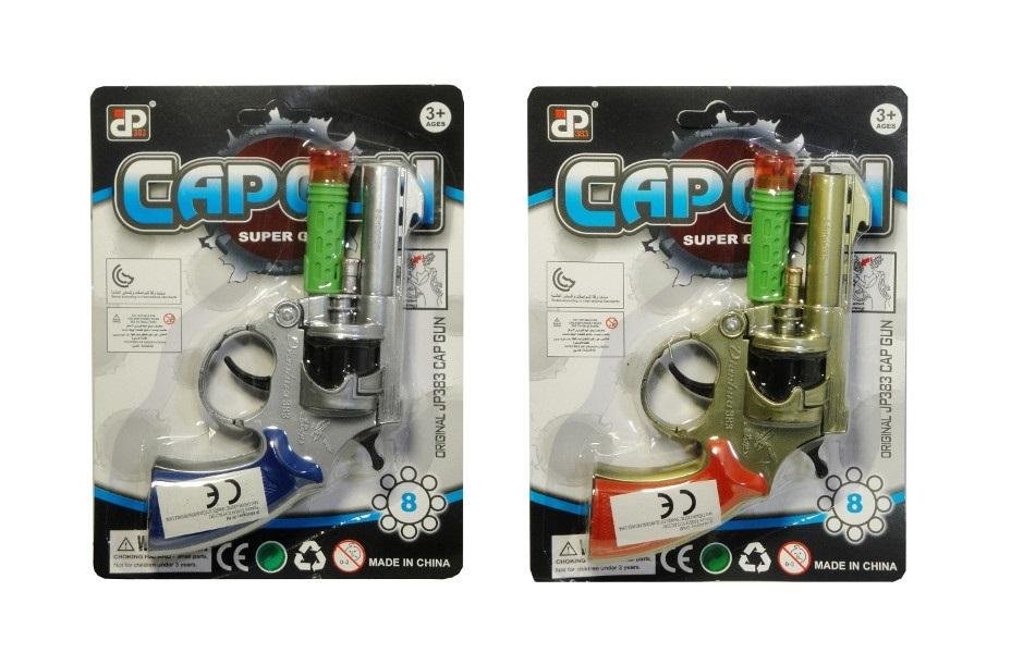 Plastikowy pistolet na spłonkę.Produkt zapakowany w kartonową podstawkę z przezroczystym kloszem. Zabawka dla dzieci od 3 lat. Podane wymiary stanowią wymiar opakowania. Produkt występuje w kilku wersjach kolorystycznych, wybierany losowo. Cena dotyczy jednej sztuki. #