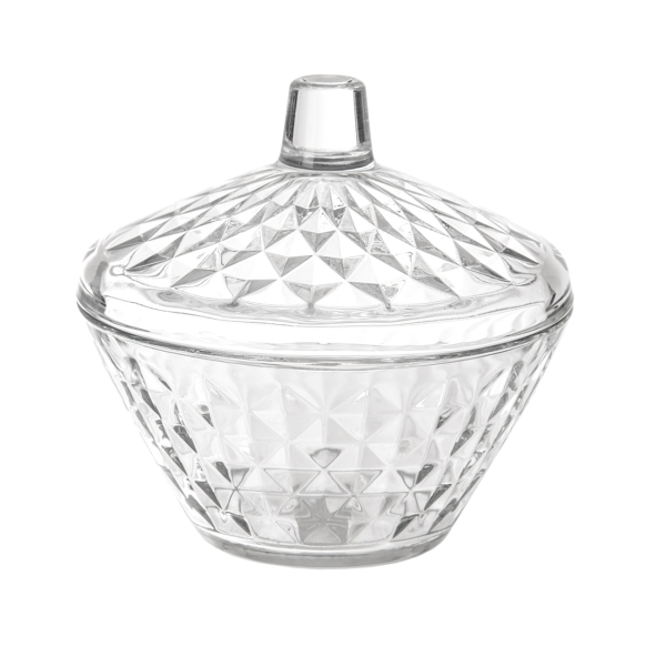 Cukřenka s víčkem ze silnostěnného skla s plastickým dekorem. Materiál: sklo. Rozměry: o. 0,33 l, pr. 12 cm, v. 6/11 cm. Lze mýt v myčce. prečítať celé