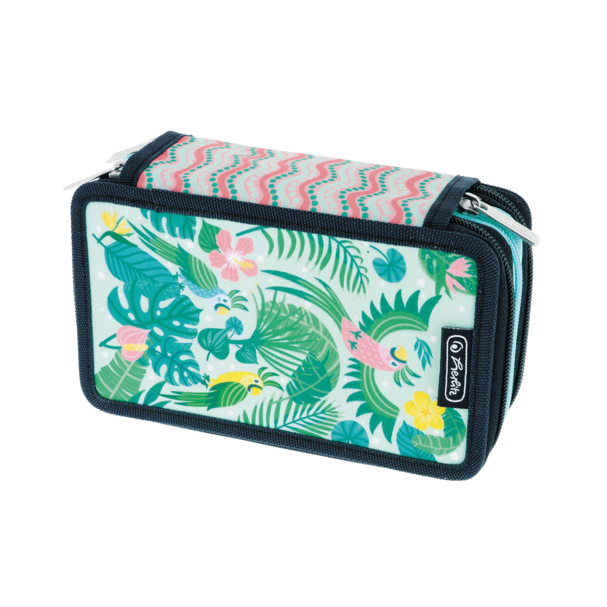 31 ks, materiál polyester, 3 přihrádky na zip (barevné), vnitřní materiál: barevný, výplň: 14 fix,8 šestihranných pastelek, 2 černé šestihranné tužky, 1 plastové ořezávátko,1 barevná šablona prečítať celé