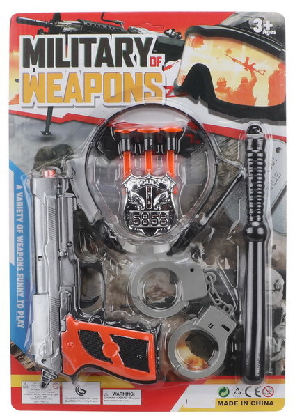Policejní set. Obsahuje pistoli, 3 náboje, pouzdro na náboje, obušek, pouta, sluchátka s mikrofonem. prečítať celé