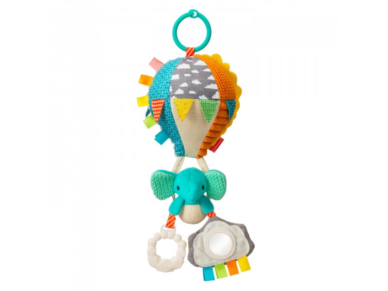Závěsná textilní hračka v podobě horkovzdušného balónu s pasažérem slonem nabízí bezpečné zrcátko, silikonové kousátko, barevné stužky a další různorodé textury ke zkoumání. Hračka ve výrazných kontrastních barvách při pohybu šustí a cinká. Plastový kroužek umožňuje snadné zavěšení na kočárek, postýlku či autosedačku.