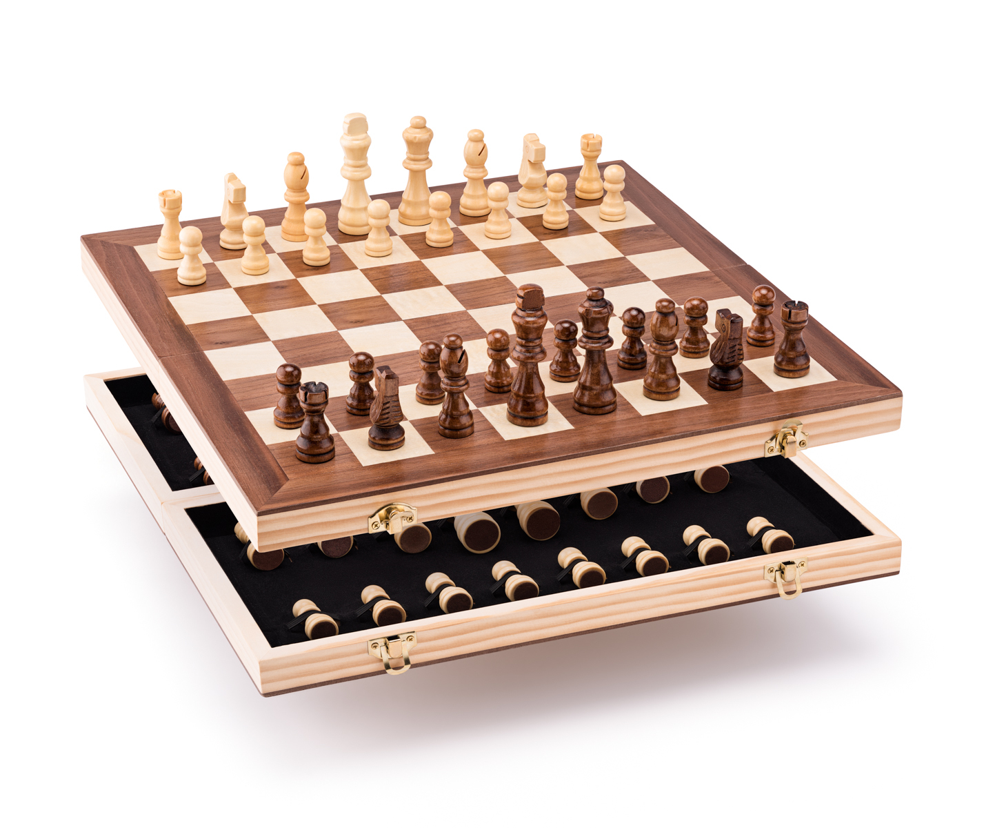 Šachovnica je vyrobená technikou intarzie z dvoch odtieňov dreva, čo jej dodáva jedinečný vzhľad a pevnosť. Po skončení hry ľahko uložíte figúrky do praktického boxu, ktorý zároveň slúži ako ochrana a elegantný úložný priestor. Súčasťou balenia je aj prehľadný návod, vďaka ktorému zvládnu hrať začiatočníci aj pokročilí bez problémov.