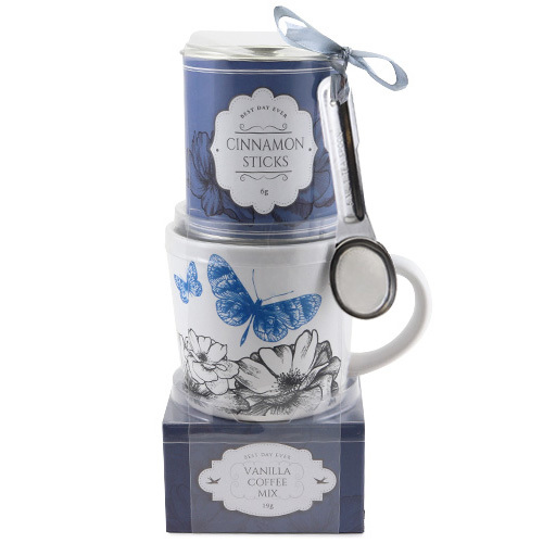 Dárková sada, Vanilková káva 19 g, hrnek s motivem květin a motýla, 200 ml, plechová dóza se skořicovými tyčinkami 6 g a lžička