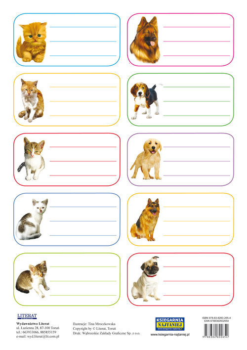 Zestaw 10 naklejek z podobiznami psów i kotów oraz miejscem na opis – do oznaczania zeszytów i książek. prečítať celé