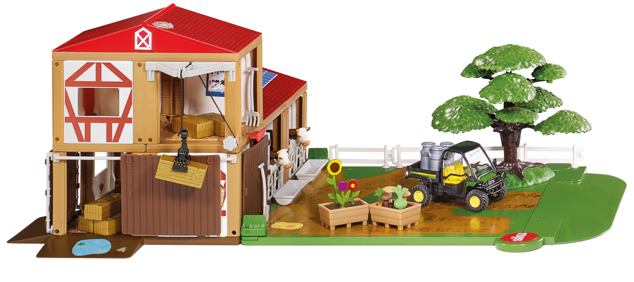 Na farmě SIKUWORLD se vždy něco děje a vždy je co dělat. Balíky sena jsou pomocí lana na navijáku zvednuty do patra stodoly. Před budovou je John Deere Gator s bandaskami na mléko. Bandasky musí být převezeny na místo sběru mléka. Dvě krávy se zvědavě dívají z kravína a čekají na zaplnění krmných...